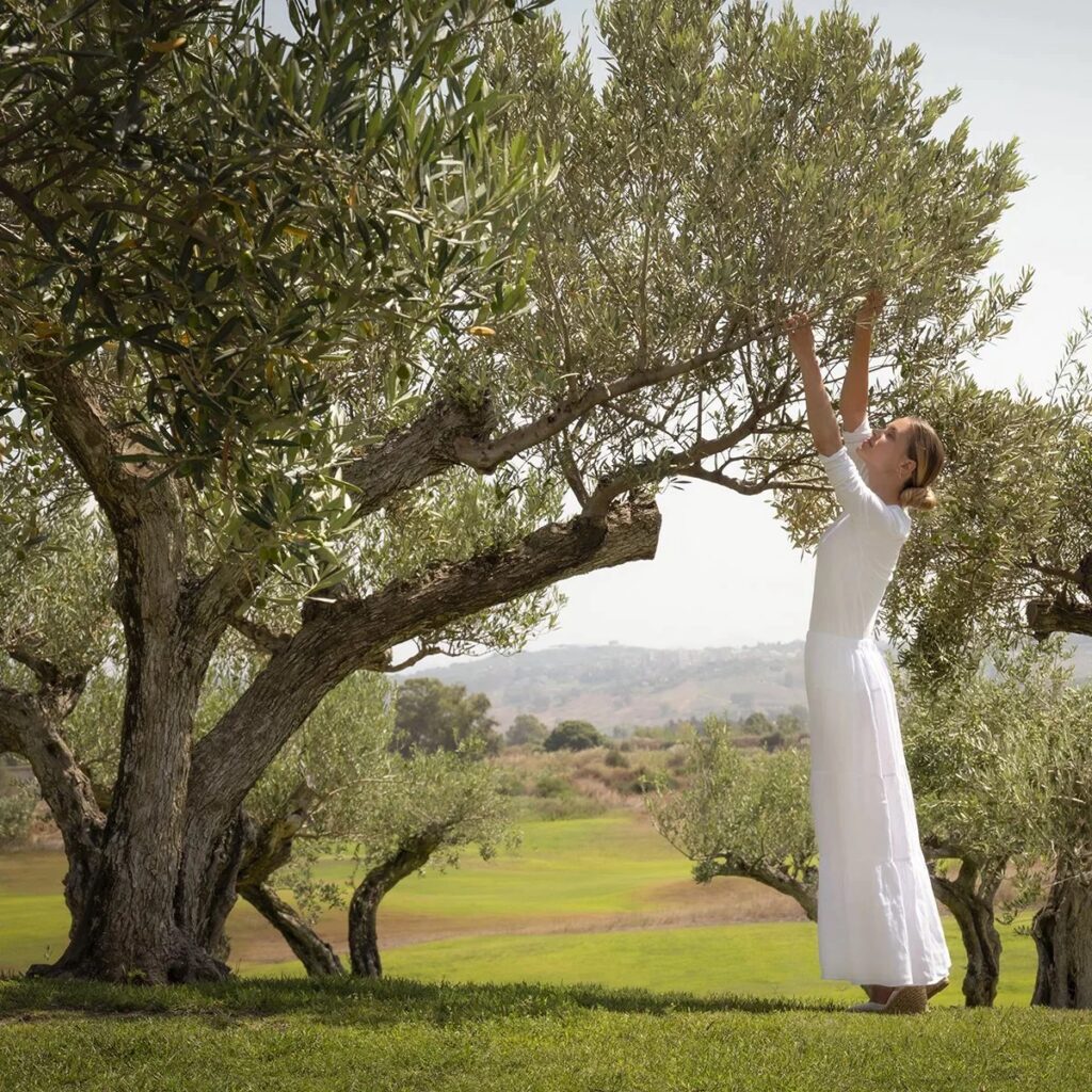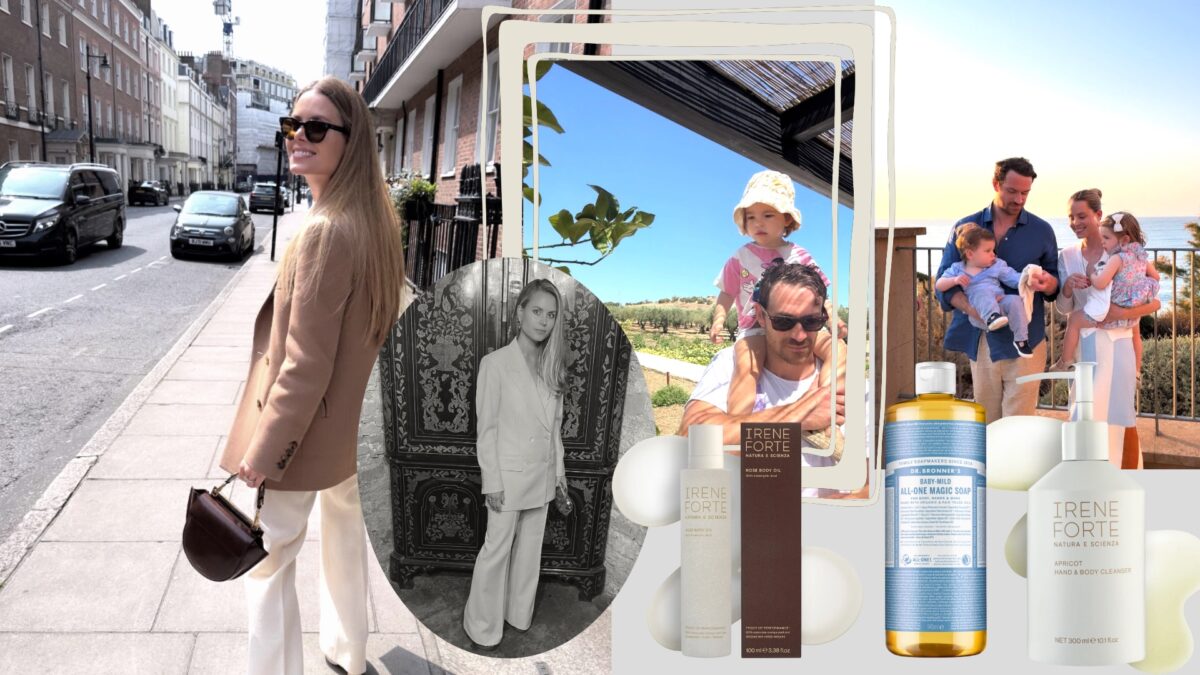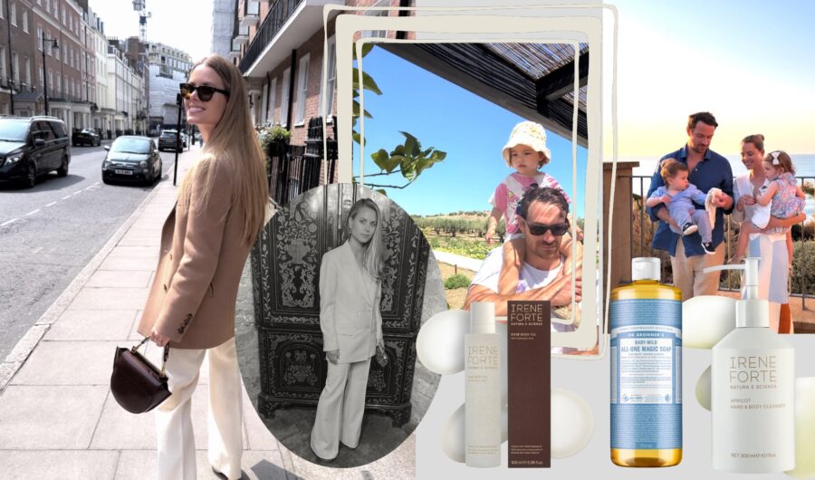 First I do my shower and skincare routine. I wash my hair once a week, and I mainly use Davines products. We now have an amenities range, so in the shower I use the apricot body cleanser, which I love. I also love the Dr. Bronner’s ‘Baby Mild All-One Magic Soap’, which I use on my kids as well. I then use one of my body oils – I love the rose one.